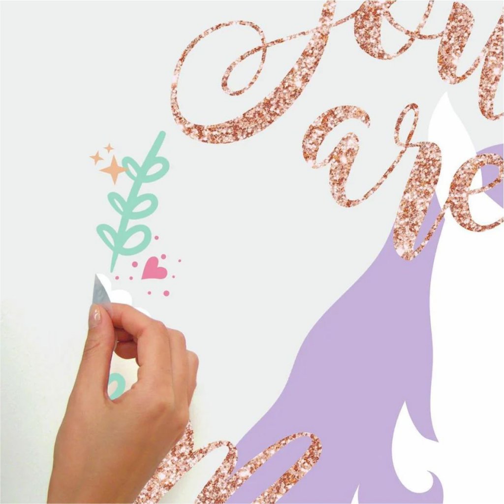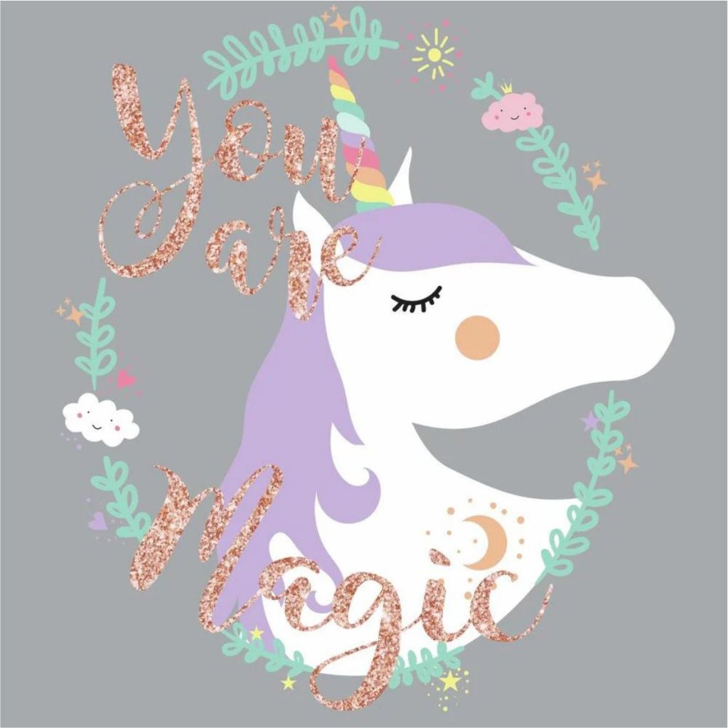 Stor dekor med enhörning. Texten glittrar.